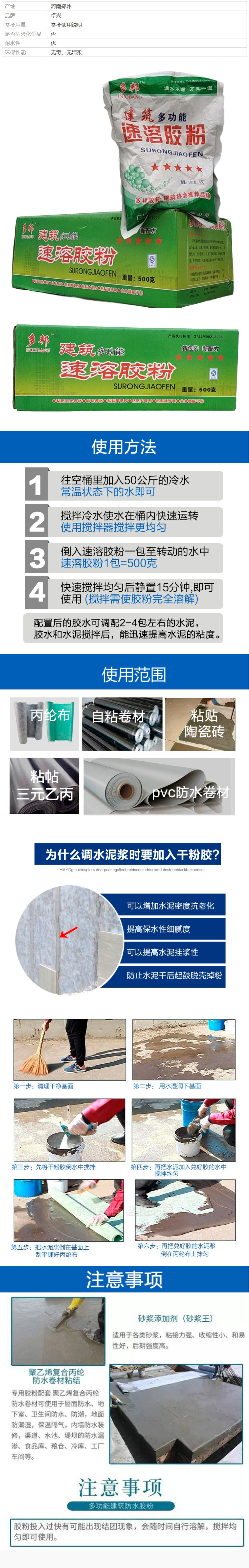 建筑速溶胶粉的使用方法简单方便,只需将其与适量的水混合搅拌后,即可直接用于各种材料的粘合。施工速度快,可大幅提高工程效率。