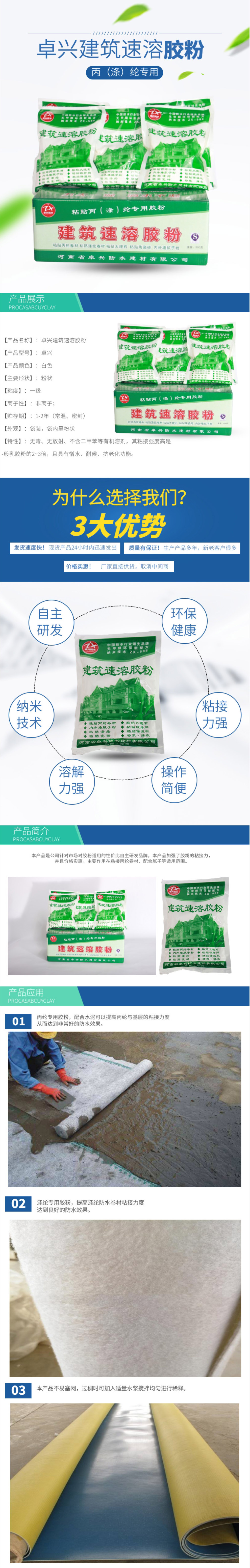卓兴建筑速溶胶粉的粘结力强,可以迅速粘合各种材料,如水泥、石膏、石材、陶瓷等,且粘合后的材料强度高、耐久性好。